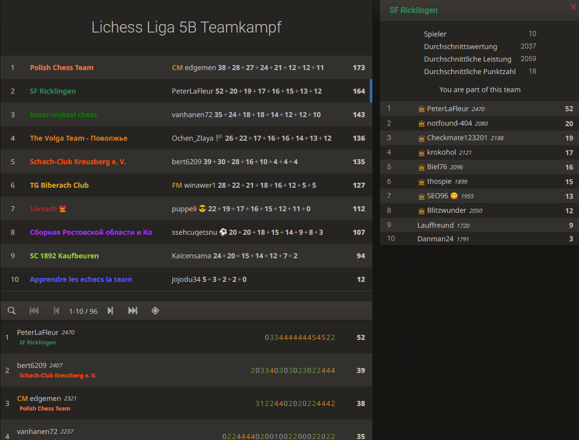 Das war ein toller, aber auch spannender Abend! Nach einem wirklich mäßigen Start belegten die Ricklinger Schachfreunde zunächst mal wieder einen der hinteren Abstiegsplätze. Dann begann aber eine phänomenale Aufholjagd! Während der Halbzeit stand bereits relativ fest, dass es diesmal wieder Liga 4 sein wird, nicht zuletzt dank der herausragenden Leistung von PeterLaFleur mit sagenhaften 52 Punkten. Er verlor lediglich sein Auftaktmatch, den Rest hat er schlichtweg niedergemäht und war auch bester Spieler der Liga! Die Turnierleistung: 2561 ELO. Notfound-404 erzielte starke 20 Punkte, gefolgt von Checkmate123201 mit 19 Punkten.