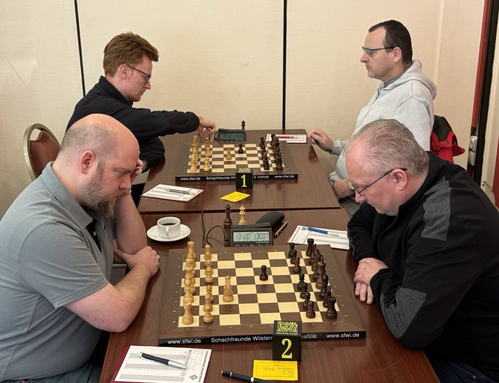 Ihren Erfolg verdanken beide ihren Siegen in der letzten Runde, in denen sie an den ersten beiden Brettern nebeneinander saßen (Nils hinten links, Benjamin vorne links). Nils gelang dabei sogar das Kunststück Stefan Kewe zu schlagen, der da schon als Turniersieger feststand. Bis dahin hatte Kewe keine Partie verloren und auch Benjamin geschlagen.